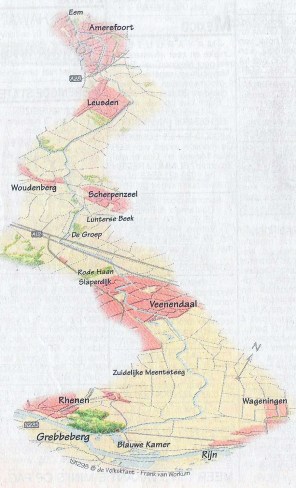 Bij de rivierdijk loopt het kanaal de Gelderse Vallei in, vroeger lag hier een sluis voor scheepjes. De zuidflank van de Grebbeberg is door de provincie Utrecht uitgeroepen tot ‘aardkundig’ monument. Twee landschappen botsen hier op elkaar. Aan weerszijden van de vallei rijzen stuwwallen op: de Utrechtse Heuvelrug (met de Grebbeberg) en de Veluwe. Rechts liggen de flats van Wageningen en Ede. (meer…)
