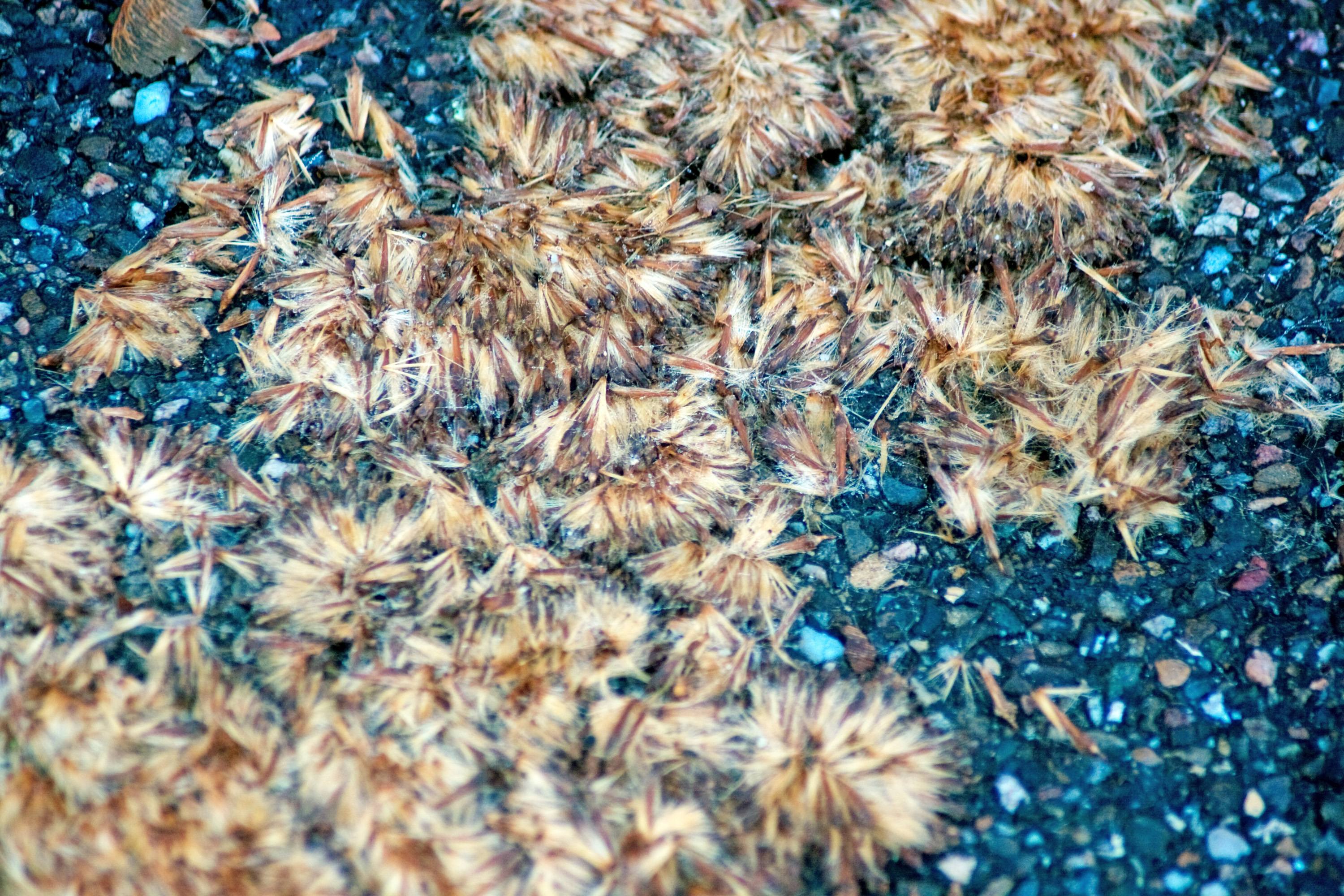 Het wandel- en fietspad ligt aan het eind van het jaar bezaaid met duizenden kleine blaadjes. De ene dag wat meer dan de andere, een beetje afhankelijk van de sterkte van de wind. Of van de regen die ervoor zorgt dat ze wat langer aan het cement blijven plakken. Dagelijks passeren voetgangers en fietsers die alles nog wat vaster aan het cement houdt. Wat na een tijdje fantastische patronen op het pad achterlaat.
