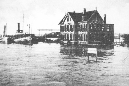 Overstromingen zijn er op het Gelders Eiland de afgelopen eeuwen volop geweest, net als overigens in de rest van de delta Nederland. En als er geen overstromingen op het Gelders Eiland waren, was er wel erg hoog water en dus een behoorlijke dreiging dat het water weer over de dijken zou kletsen. In 1906 ondervond men in maart veel overlast van de hoge stand van het water in de Rijn. Op vrijdag 13 maart 1914 is er bij Spijk om 16.00 uur een dijkdoorbraak die het hele dorp blank zet. Alle huizen komen onder water te staan en ook de gloednieuwe kerk en de steenfabrieken houden het niet droog. Veel bewoners vluchten naar de zolders, anderen zoeken hun toevlucht op daken. Veel huisgezinnen verliezen ‘al hun have en goed’. In 1920 is het weer hoogwater. Als gevolg van grote massa’s smeltende sneeuw en overvloedige regen staat het water in de rivieren eind 1919 en begin 1920 uitzonderlijk hoog. Op 29 december loopt de Pannerdense Waard onder. Via de Oude Rijn en de Wildt stroomt veel water naar de Oude IJssel, waardoor Wehl en Angerlo te maken hebben met wateroverlast. In Lathum gaat men op Nieuwjaarsdag ‘s morgens zoals gewoon om 05.00 uur aan het werk, maar vijf uur later staat alles onder water. Begin januari 1920 kamperen op het Gelders Eiland honderden gezinnen op de dijken. Door een defect aan een sluis raken ook de dorpen Aerdt en Herwen onder water. In Herwen staat het water tot het dak van de zuivelfabriek. Hieronder twee foto’s van het hoogwater in 1908 (boven) en 1920 (onder).