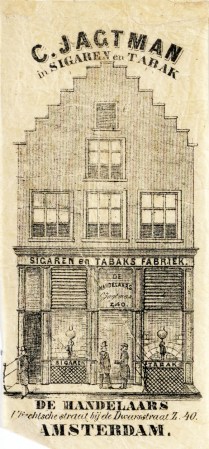 Een sigarenzakje is een papieren zakje waarin sigaren verpakt werden. In een sigarenzakje werd gewoonlijk een enkele sigaar of hooguit een klein aantal daarvan verpakt. Het zakje vrijwaarde de sigaar van beschadigingen en hield het aroma beter vast. Het sigarenzakje is in de eerste helft van de 19e eeuw ontstaan; de oudst bekende exemplaren stammen uit omstreeks 1840. In die tijd werd het roken van sigaren steeds meer een gewoonte en omdat de sigaar een relatief duur product was, kreeg elke winkelier/handelaar de noodzaak zijn product een goede verpakking te geven. Omdat de sigaar per stuk of zeer kleine aantallen werd verkocht en het een erg kwetsbaar product was, lag een verpakking per sigaar voor de hand. Zo’n verpakking beschermde de sigaar niet alleen tegen beschadiging, stof en vuil, maar zorgde er ook voor dat het aroma beter werd geconserveerd. Verpakt in een eenvoudig bedrukt papieren zakje was de sigaar geschikt voor transport en kon door de koper in de binnenzak of onder de hoed worden meegenomen. Die oudste sigarenzakjes werden van stevig papier gemaakt en kreeg daarmee bijna de uitstraling van de toen gangbare papier machee sigarenkoker. Het was niet zomaar een zakje, maar eerder een enveloppe met een sluitdriehoek. De luxe uitvoering, die nog erg lijkt op de sigarenkoker, wordt ook nog extra benadrukt door de opdruk in gravurestijl. Rond 1870 was het sigarenzakje een algemeen gangbaar verpakkingsmiddel geworden. Met de opkomst van de commerciële drukpers vanaf circa 1860 kwam ook in zwang deze sigarenzakjes te bedrukken, soms met op de achterzijde een rebus (zie hieronder een voorbeeld). De zakjes werden fraai bedrukt met gestileerde tabaksplanten, allegorische voorstellingen van handel en scheepvaart, rokende morianen of dito andere personen of afbeeldingen van spraakmakende gebouwen. Vaak werd op een sigarenzakje ook de winkelpui van de sigarenhandel weergegeven, met de naam van de winkel en winkelier. (meer…)